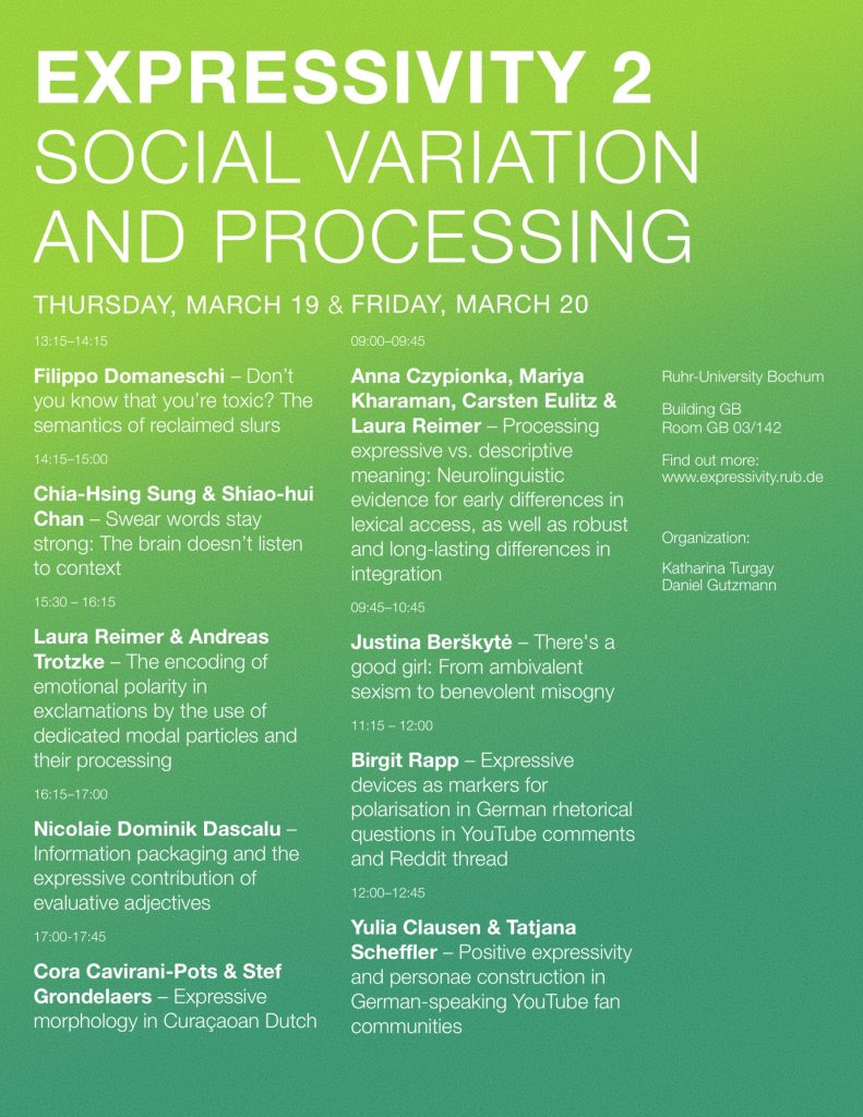 Am 19. und 20. März findet der von Katharina Turgay und Daniel Gutzmann organisierte, internationale Workshop Expressivity 2: Social Variation and Processing statt, im Rahmen dessen sich Expert:innen expressiver Sprache aus psycho- bzw. neurolinguistischer bzw. soziolinguistischer Perspektive nähern. Justina Berškytė (University of Manchester) wird einen Invited Talk mit dem Titel There’s a good girl: From ambivalent sexism to benevolent misogny halten und Filippo Domaneschi (University of Genoa) zu Don’t you know that you’re toxic? The semantics of reclaimed slurs.